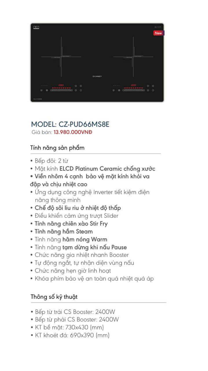 Bếp từ đôi Canzy CZ-PUD66MS8E – Thiết kế sang trọng, công nghệ hiện đại