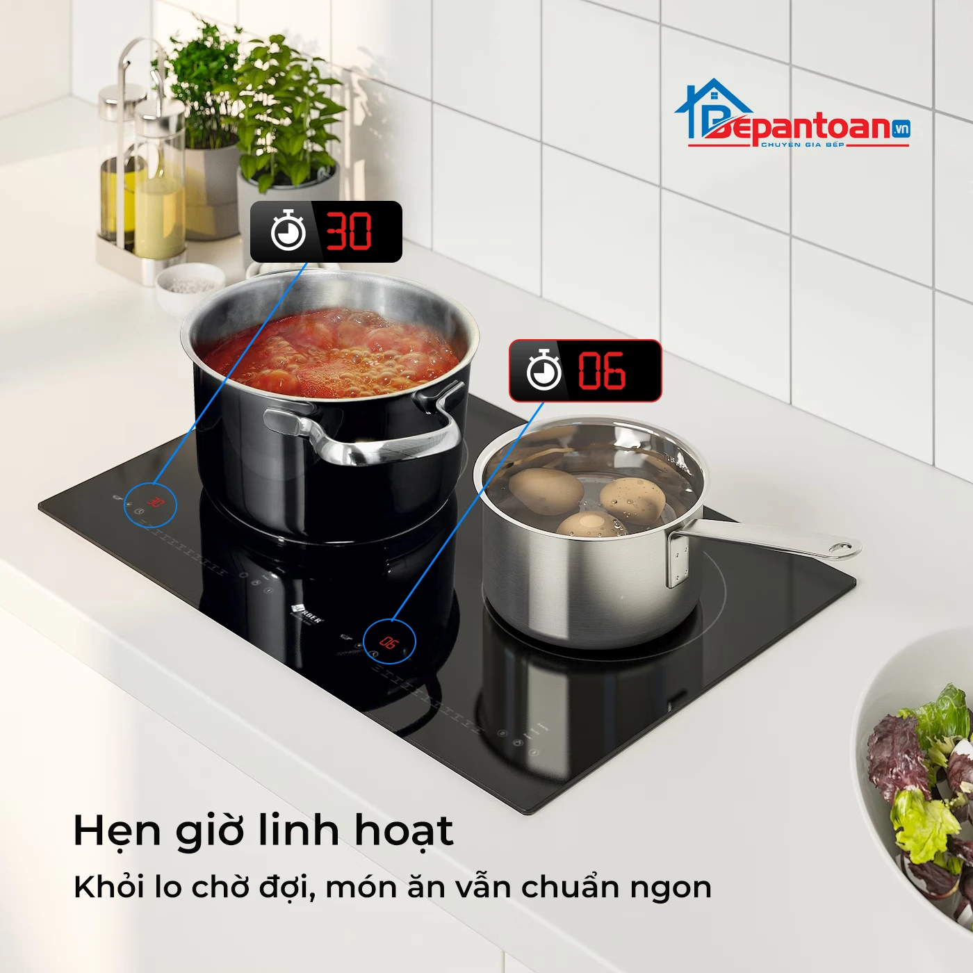 Bếp tích hợp chế độ cảm biến nấu linh hoạt như xào rán, hầm… giúp người dùng dễ dàng lựa chọn chế độ phù hợp cho từng món ăn. Ngoài ra, chức năng hẹn giờ độc lập cho từng vùng nấu với thời gian lên tới 9 giờ 30 phút giúp bạn chủ động hơn trong việc nấu nướng mà không cần đứng bếp liên tục.
