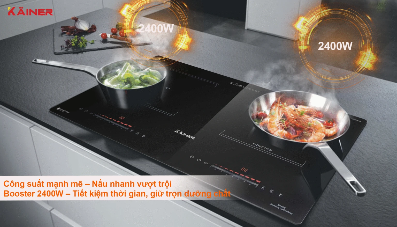 Tổng công suất lên tới 4000W: gồm 2 vùng nấu , mỗi bên 2000W, có thể kích hoạt Booster lên tới 2400W – rút ngắn thời gian nấu chỉ còn một nửa.