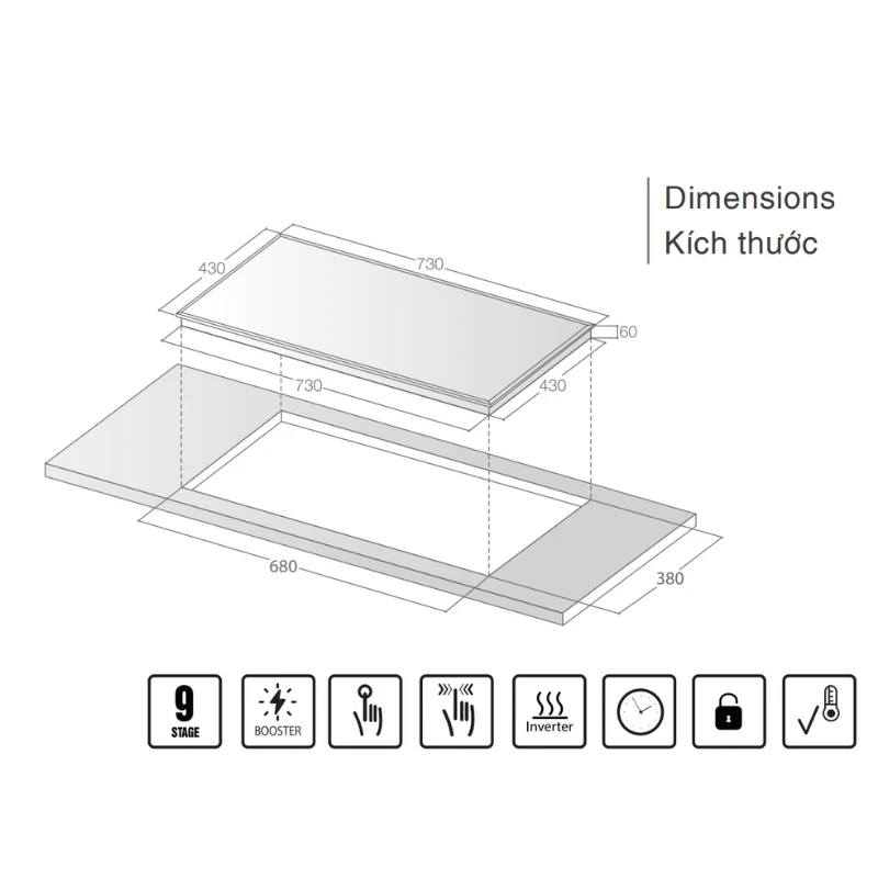 Kích thước mặt kính: 730mm (Rộng) x 430mm (Sâu) x 60mm (Cao)