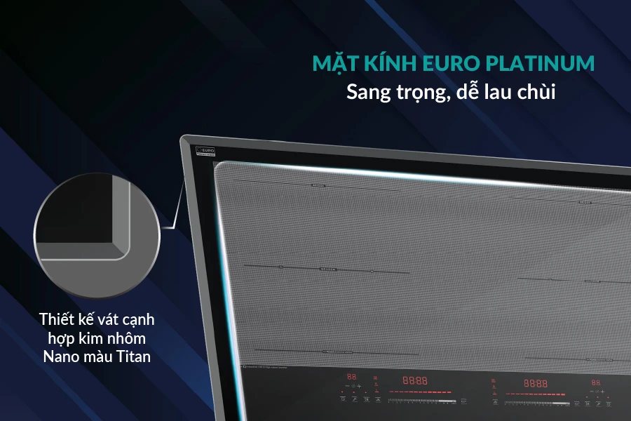 Mặt kính EURO Platinum: Chất liệu kính cao cấp được vát 4 cạnh kết hợp với viền hợp kim nhôm Alloy Carbon 3D mạ Nano màu Titan, tạo nên sự bền bỉ và đẳng cấp.