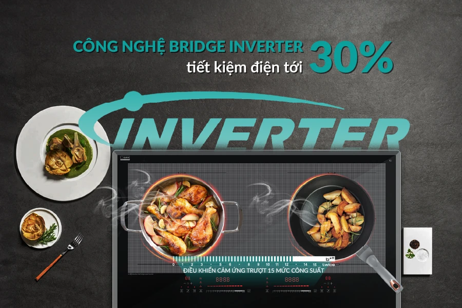 Công nghệ biến tần Half Bridge Smart INVERTER: Giúp đun nấu liên tục ở mức nhiệt thấp mà không bị tắt mở, tiết kiệm đến 40% điện năng.