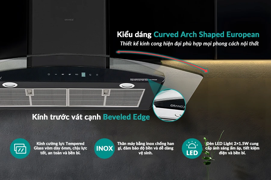 Kiểu dáng: Hút mùi GX H90C62B sở hữu thiết kế Curved Arch Shaped European, dạng kính cong hiện đại, hài hòa với mọi không gian bếp.
