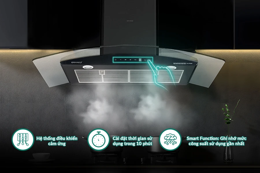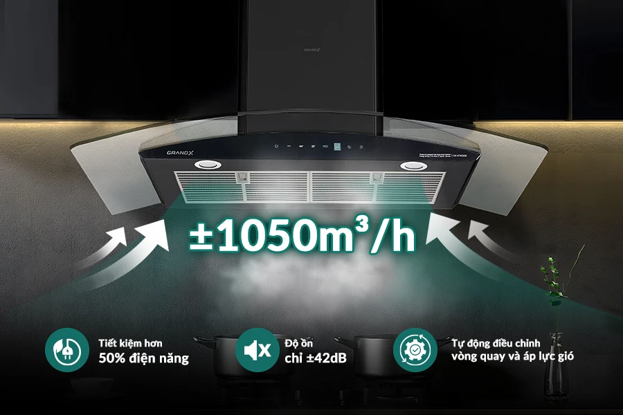Công suất hút mạnh mẽ: Hút mùi GX H90C62B đạt lưu lượng hút ±1050m³/h, nhanh chóng loại bỏ khói và mùi khó chịu, giữ bếp luôn trong lành.