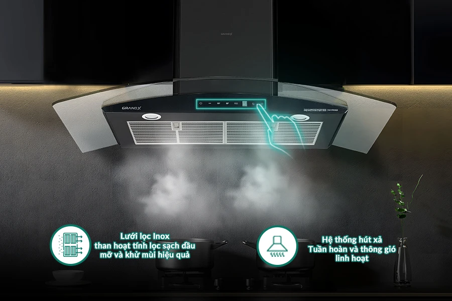 Khử mùi than hoạt tính: Công nghệ khử mùi bằng than hoạt tính, loại bỏ triệt để khói và mùi, mang lại không khí trong lành cho gian bếp.