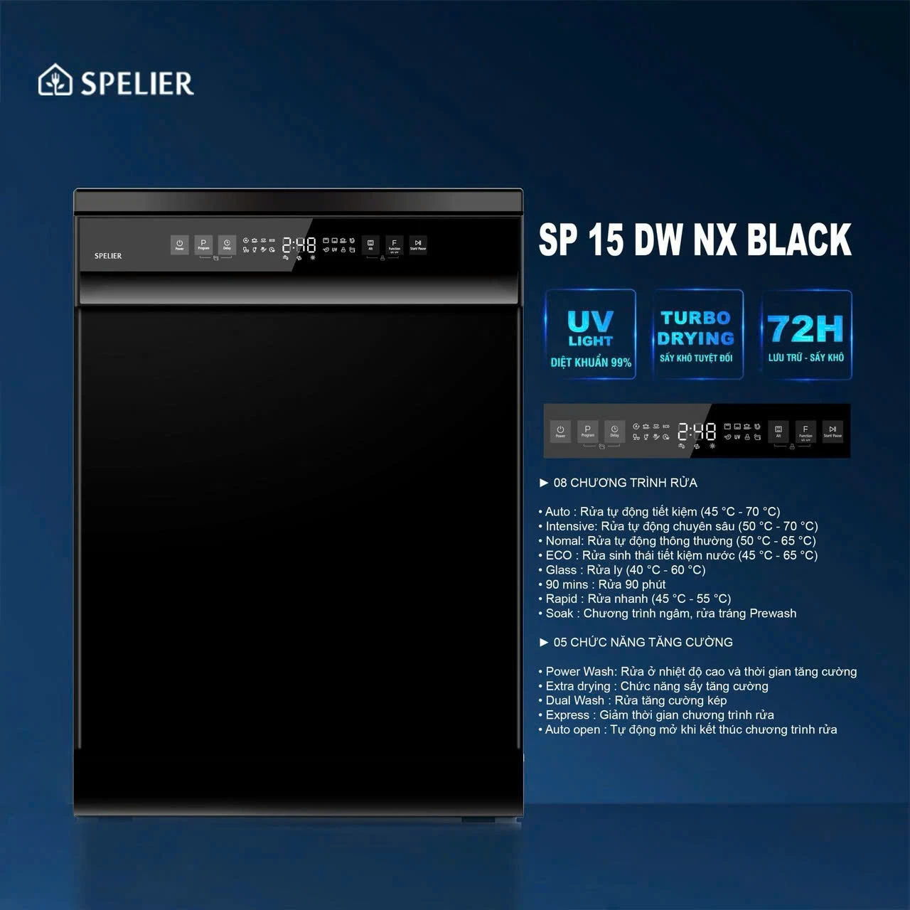 Máy rửa bát Spelier SP 15 DW NX BLACK có công suất tiêu thụ 1760-2100W, lượng nước tiêu thụ trong khoảng 4-9 lít/1 lần rửa, cho phép rửa 15 bộ bát đĩa Châu Âu. Máy trang bị 8 chương trình rửa được tùy chỉnh dễ dàng trên bảng điều khiển điện tử kết hợp màn hình LED.