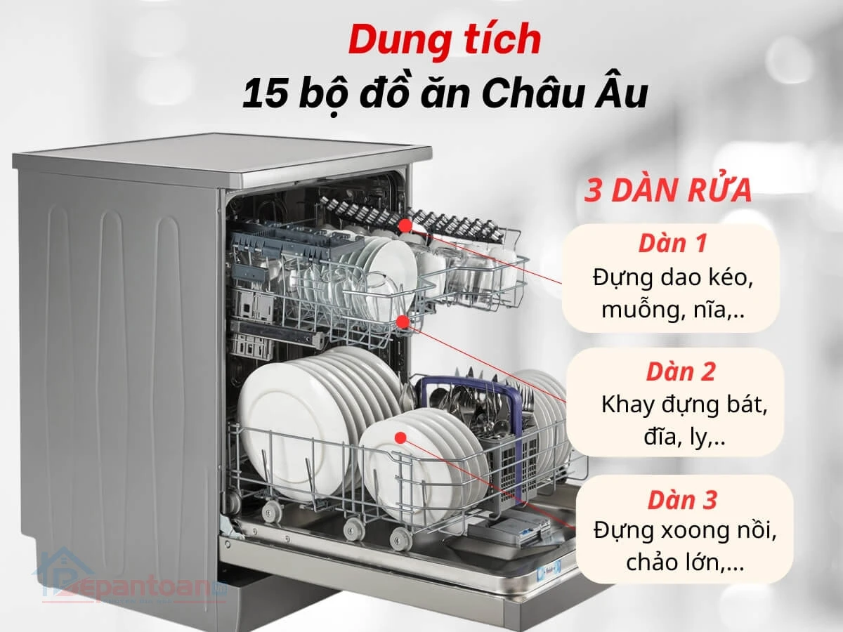 3 dàn rửa, dung tích 15 bộ đồ ăn châu Âu