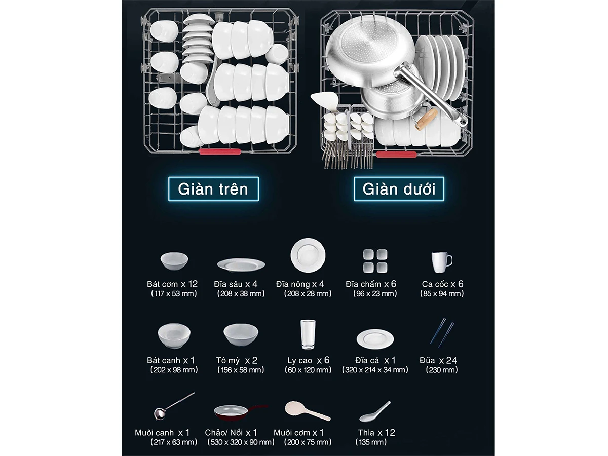 Thiết kế 2 giàn rửa, chứa tối đa 12 bộ chén đĩa châu Âu