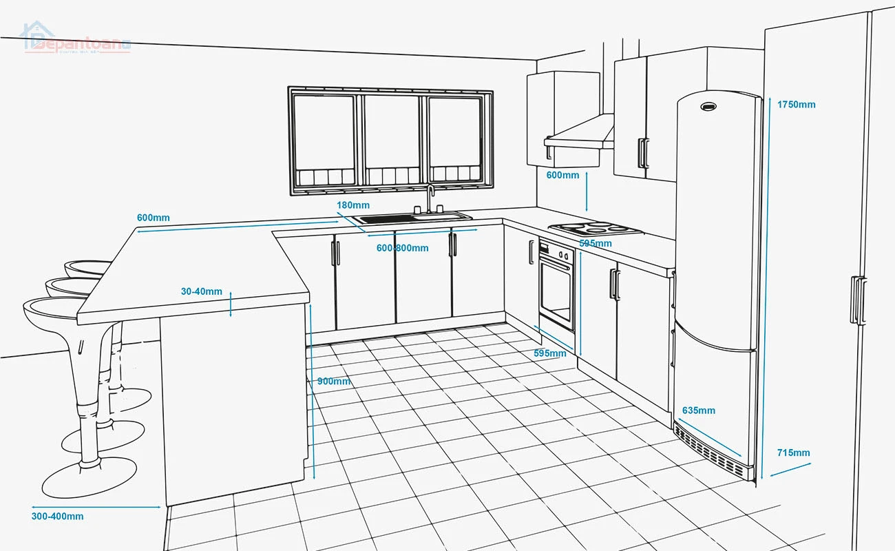 - Kích thước chiều sâu tủ bếp: Chiều sâu của tủ bếp trên thường từ 30cm đến 40cm. Infographic sẽ minh họa cách chiều sâu này ảnh hưởng đến việc lắp đặt máy hút mùi âm tủ, đảm bảo máy không bị nhô ra quá nhiều, gây mất thẩm mỹ.