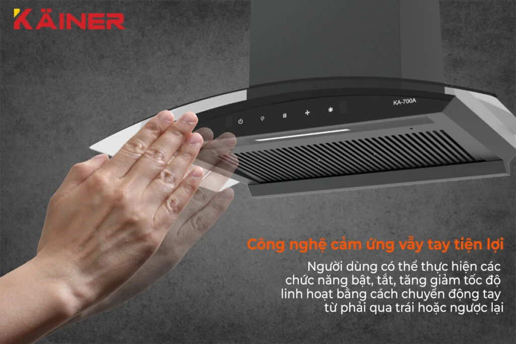 Máy hút mùi Kainer KA-700A được trang bị bảng điều khiển cảm ứng với giao diện trực quan, giúp người dùng dễ dàng chọn mức tốc độ hút phù hợp với lượng khói mùi phát sinh trong khi nấu. Thiết kế cảm ứng không cần tiếp xúc tay trực tiếp, rất tiện lợi khi tay đang bẩn hoặc ướt.