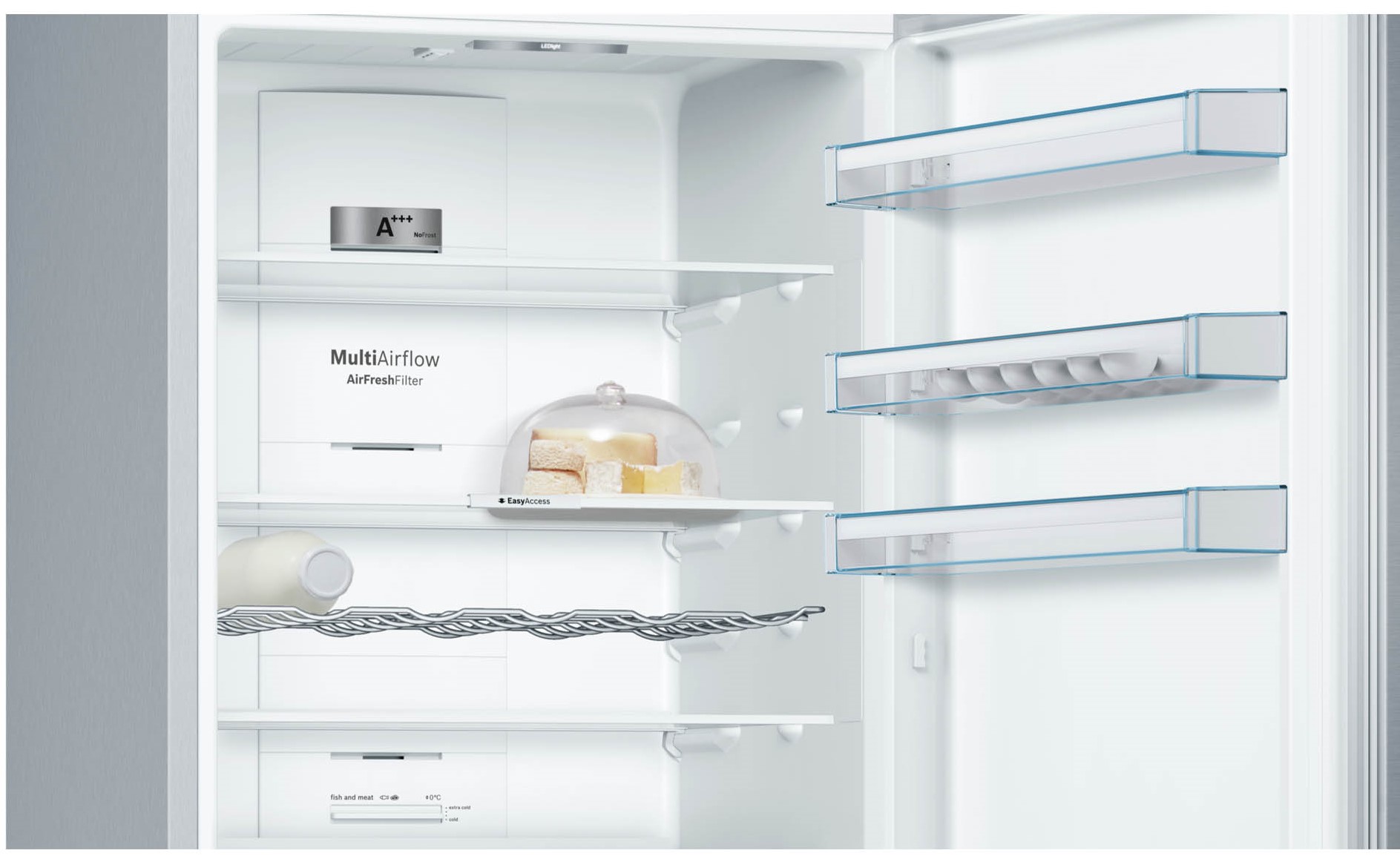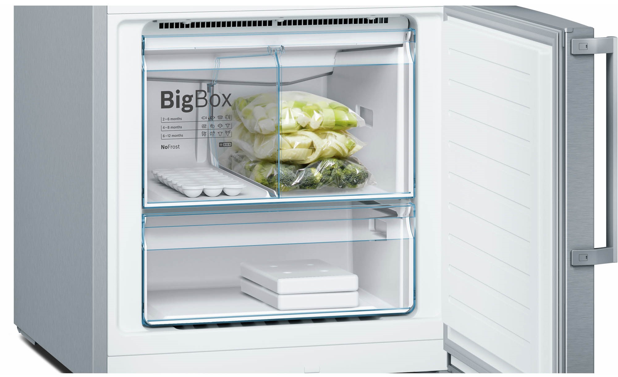 Ngăn chứa đông lạnh Big Box của tủ lạnh KGN56XI40J serie 4 giúp người dùng có một không gian để thực phẩm rộng hơn và sâu hơn. Với dung tích chứa lớn như vậy, bạn có thể xếp chồng được nhiều thực phẩm vào bên trong như bánh gato, pizza,...